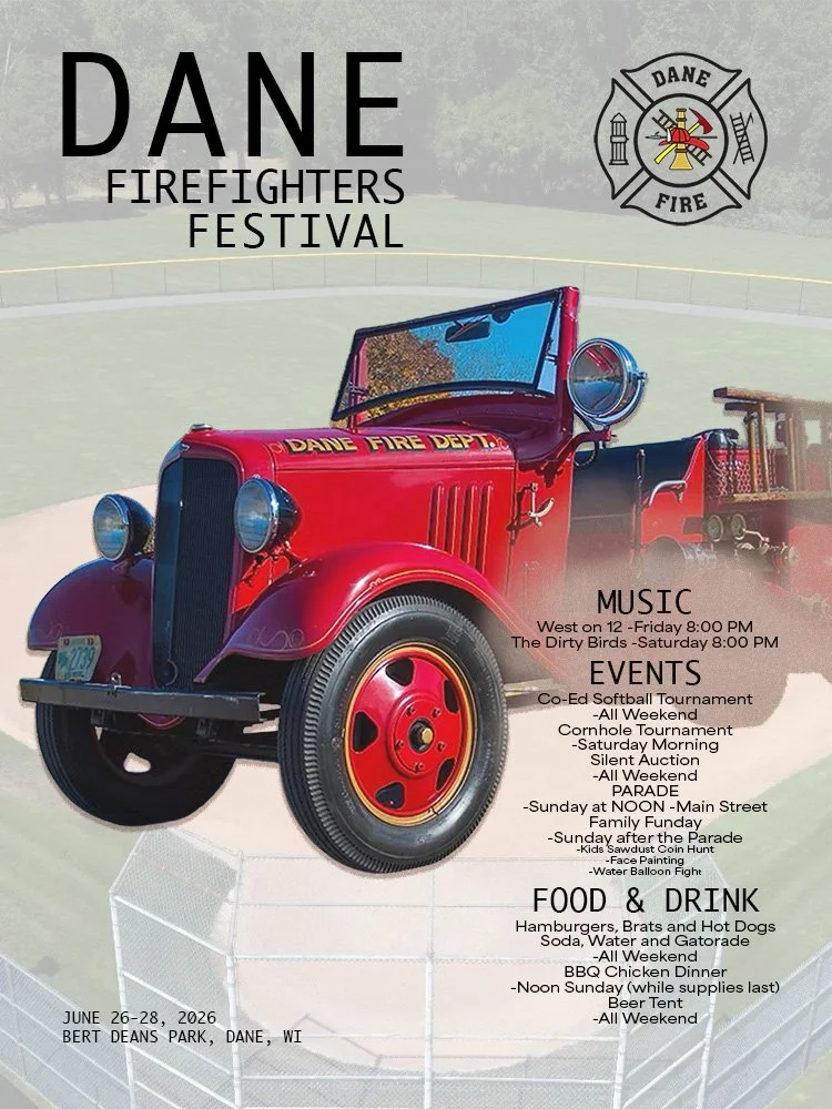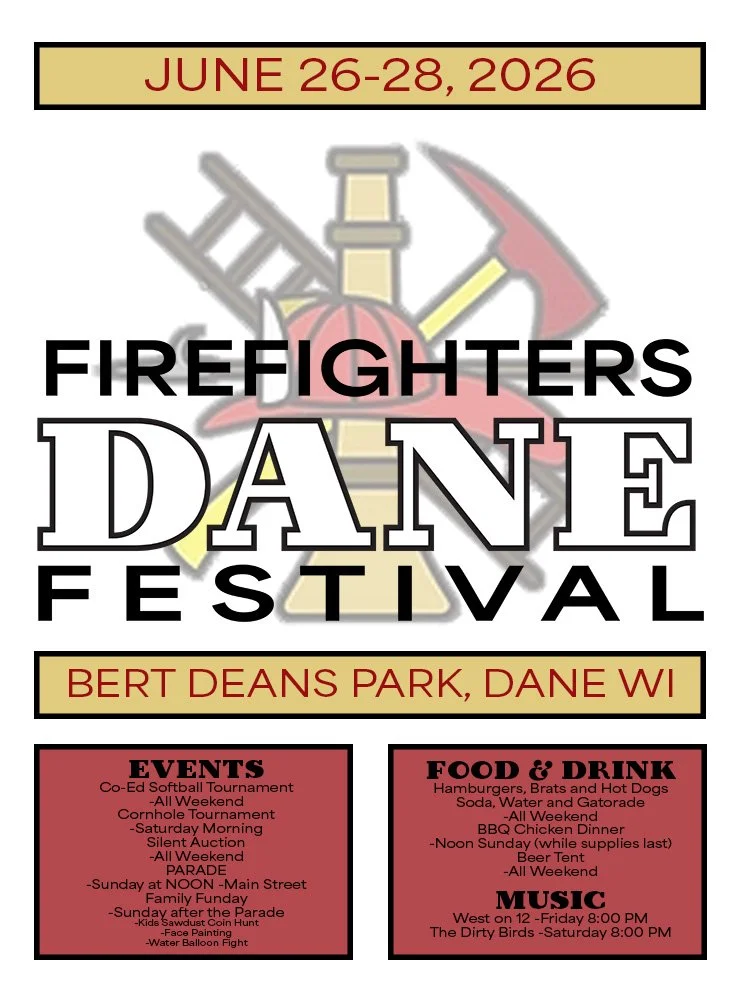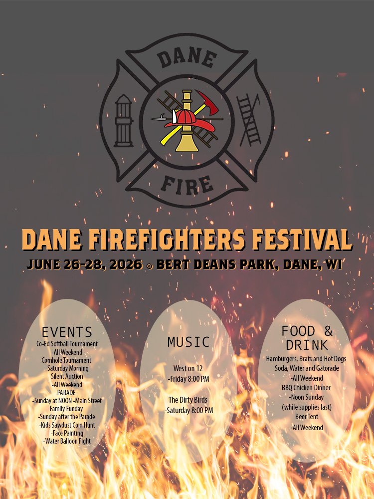 The last weekend in June, every summer, the community gathers to raise funds for the Dane Fire Department. There are softball and bags tournaments, family activities, food and drinks for all.